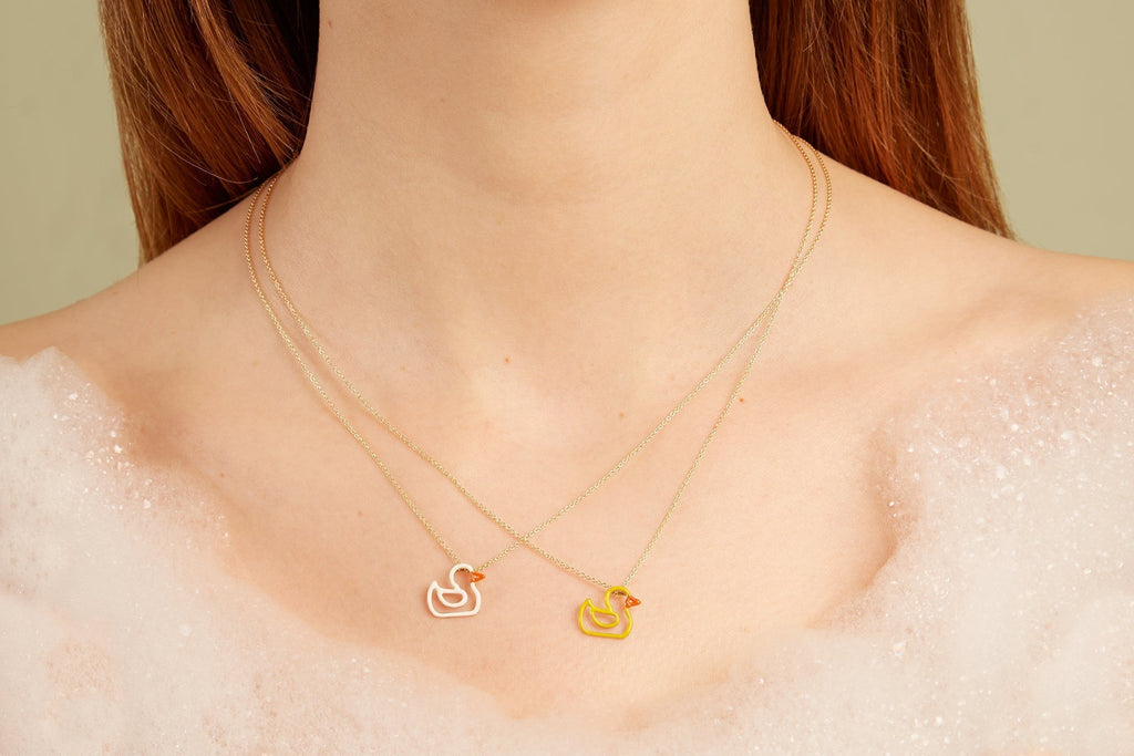シャボン玉いっぱいのバスタブに入り、PATITO ENAMELネックレス(アヒルの子)と一緒にリラックスタイムを楽しんでください。このネックレスは、リラックスと落ち着きを求める人に理想的なジュエリーです。