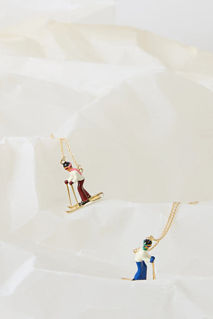 ゴールドで丁寧に作られたスキーネックレスで、冬の活気あふれる雰囲気を演出しましょう。白とスカイブルーのエナメルスーツに鮮やかな赤いスカーフを身に着けた、生き生きとしたスキーヤーのペンダントがアクセントになっています。軽やかでありながらエレガントなこのネックレスは、雪景色の中でのスリルを表現し、どんな装いにも爽やかな季節感をプラス。スキー好きの方にぴったりのアイテムです。