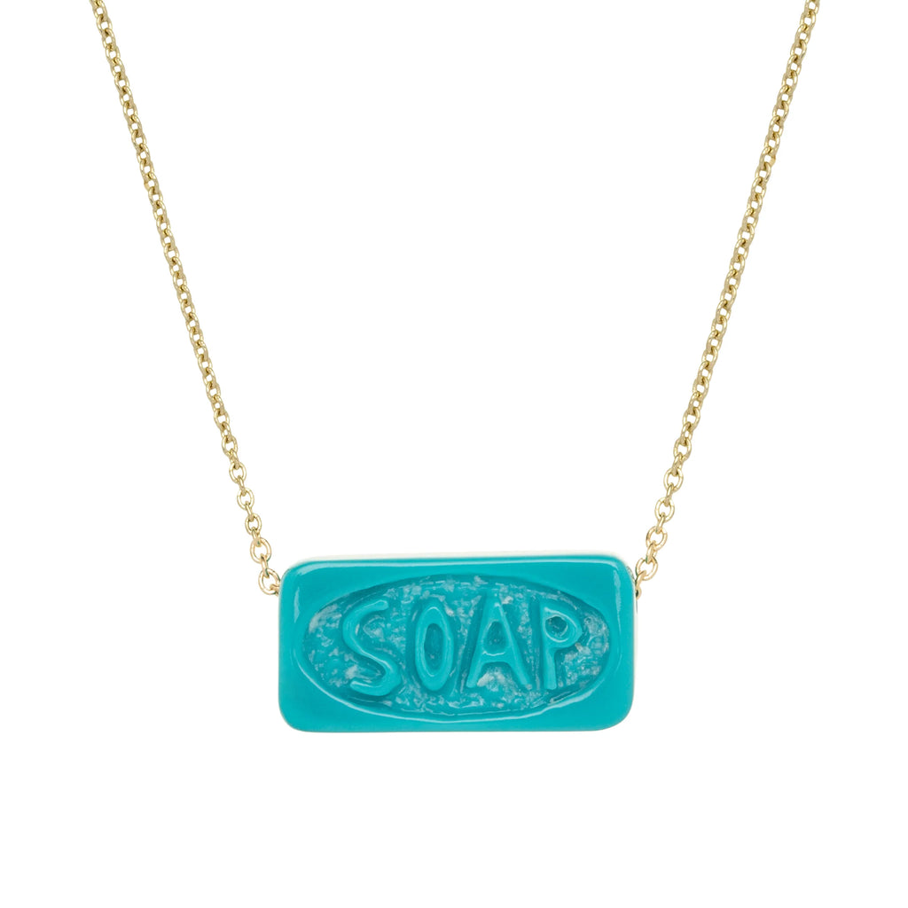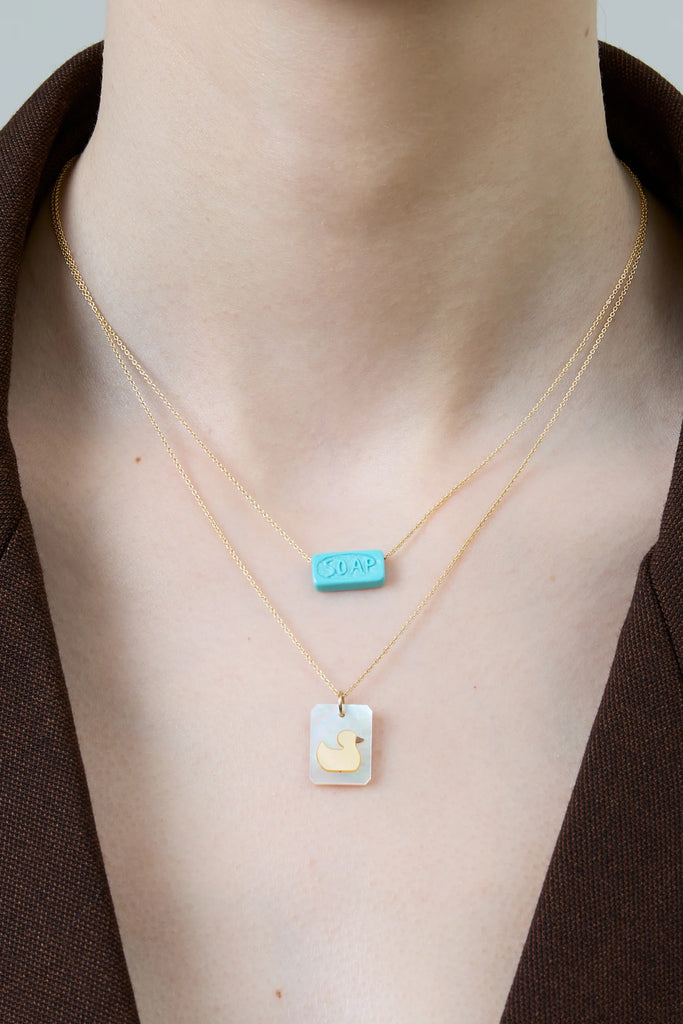石鹸…でも、それは特別な存在。ソープペンダントは、ターコイズを手彫りし、9金イエローゴールドのチェーンに通したものです。手触りは柔らかく、本物そっくりの形をしていますが、全く予想外の存在感を放ちます。泡立ちませんが、きっとあなたを笑顔にしてくれるでしょう。日々の習慣やセルフケアへのささやかな賛歌。シンプルな小さな彫刻として単独で身に着けるのも良し、カメオ・ペルラ・パティートネックレスと重ね付けするのも良し。だって、お風呂の時間だって、愛の物語になり得るのですから。