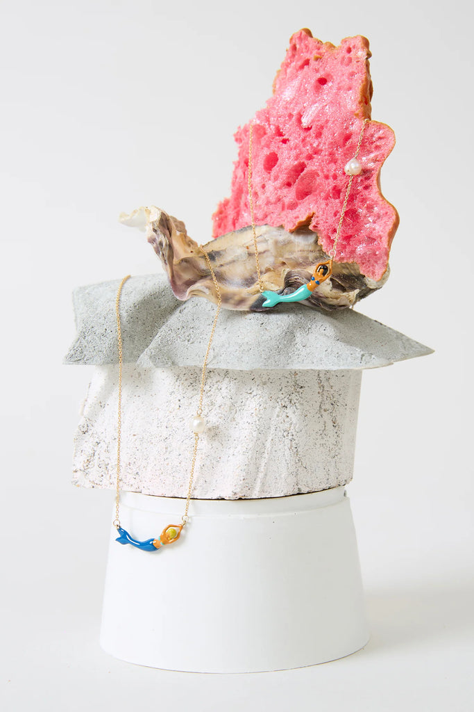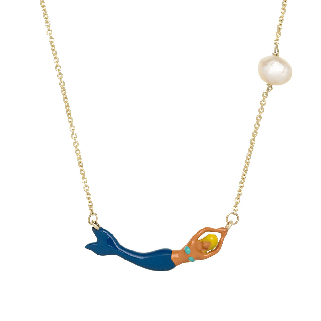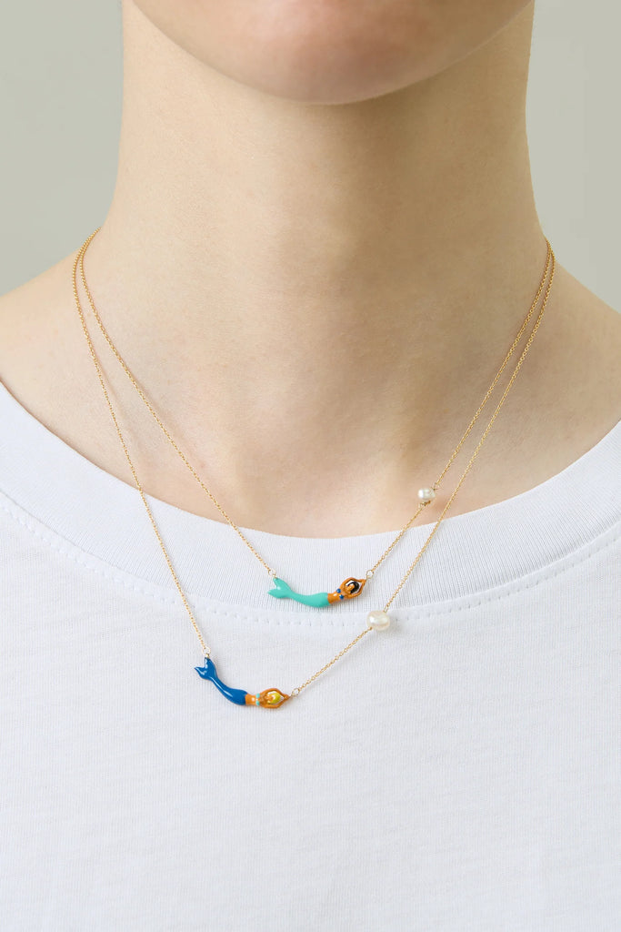 遊び心にあふれ、輝きに満ち、どこか魔法のような魅力を持つマーメイド。鮮やかなブルーのエナメルの尾と金色の髪を持つ彼女は、自由と冒険の象徴です。天然パールが、まるで波間から集めた秘密のように、貴重な輝きを添えます。目を閉じていても、まるで旅をしているような気分になれる、そんなジュエリーを身につけてみませんか。