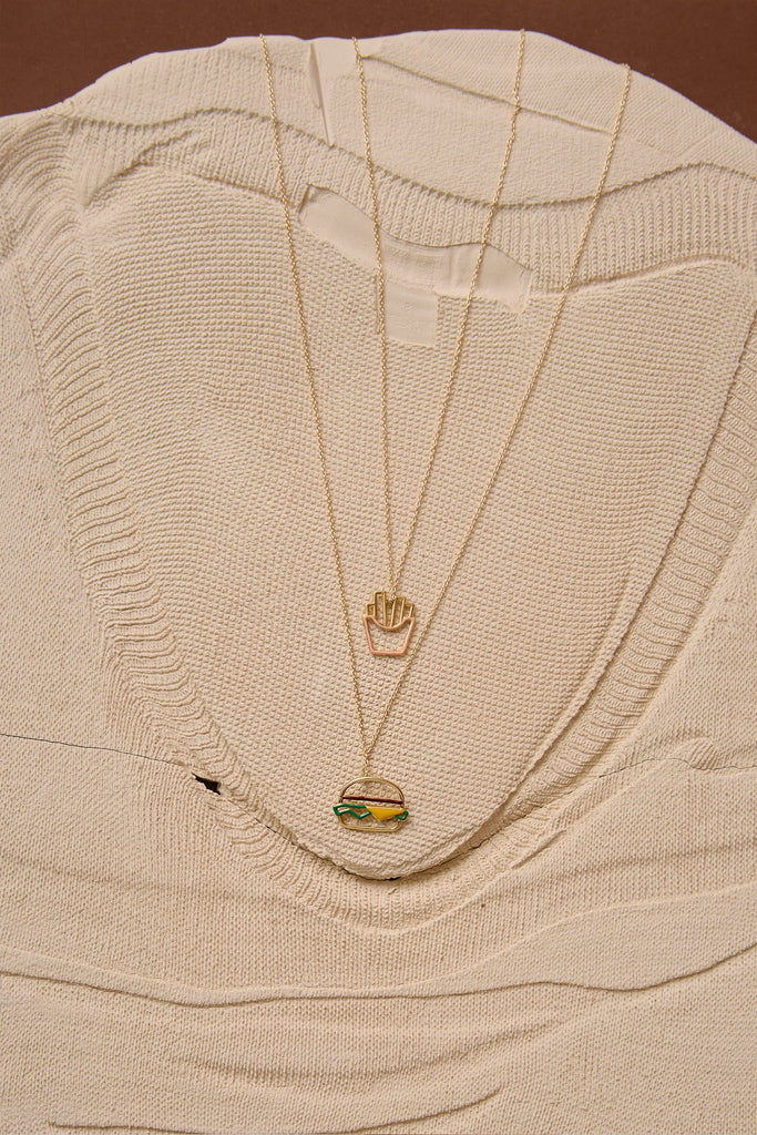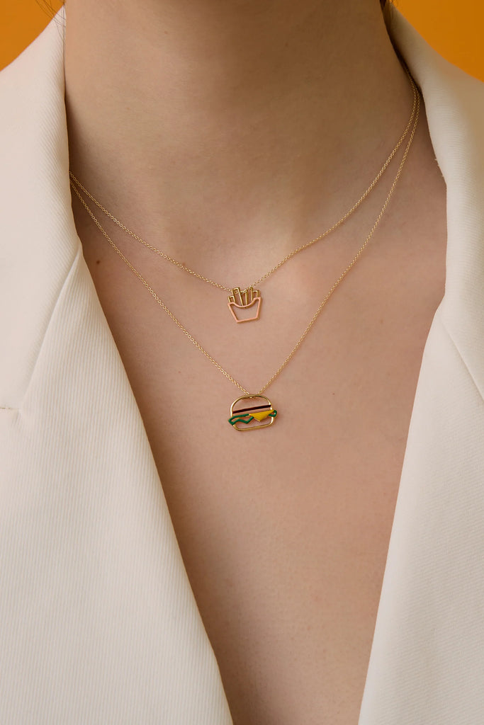 ハンバーガーネックレスは、食いしん坊さんにとって最高に楽しくてキュートなアクセサリーです!パピタス(フライドポテト)ネックレスと組み合わせれば、まさに完璧な組み合わせ!