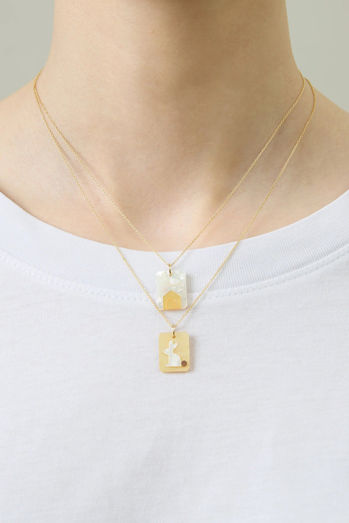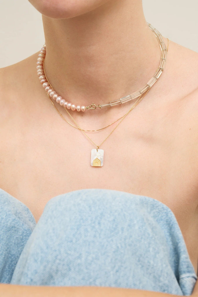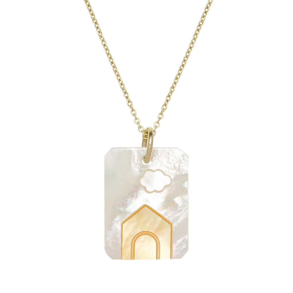 柔らかな雲の下にそっと浮かぶ、夢見るような小さなお家「CAMEO PERLA CASITA」は、ALIITAが心を込めて作り上げた、ミニチュアの情景を閉じ込めたネックレスです。虹色に輝くホワイトマザーオブパールの背景に、温かいイエローのマザーオブパールでできた家が配されています。一つ一つの要素は、細心の注意を払った手作業による専門的な「マルケトリー(象嵌細工)」の技術により命を吹き込まれています。個々のマザーオブパールのピースを継ぎ目なく組み合わせることで、この小さくも喜びに満ちた風景が完成します。
