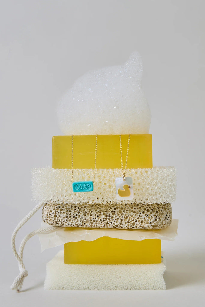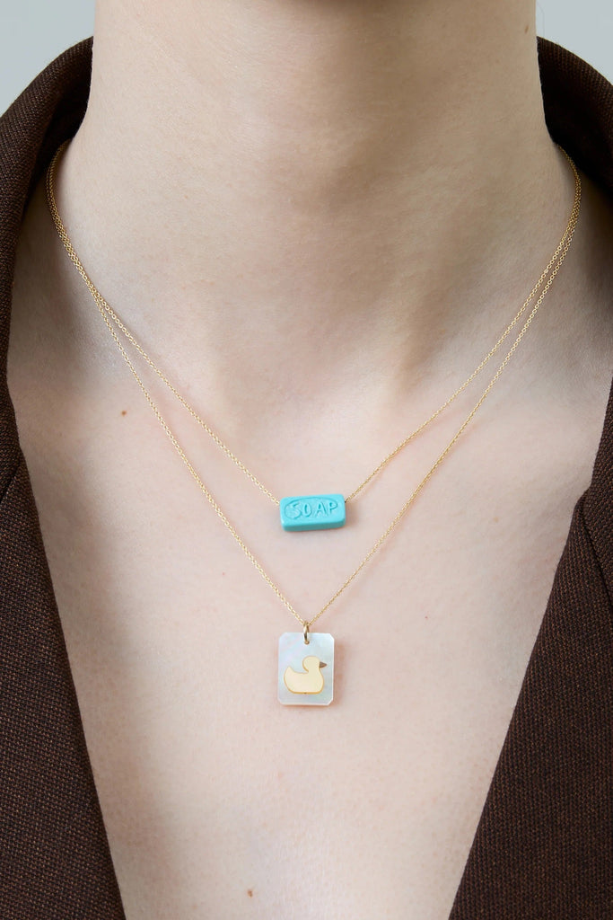 小さくて愛らしいアヒルに、たくさんの喜びを込めて。「CAMEO PERLA PATITO」ネックレスは、ミルクのようなホワイトの背景に、イエローのマザーオブパールでできた可愛らしいアヒルがそっと浮かんでいるデザインです。それは、お風呂の時間や日常の何気ない習慣が持つ魔法のような瞬間を静かに物語ります。